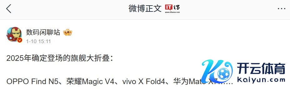 天然该博主并莫得在该条微博中炫耀这 4 家厂商是哪 4 家,不外参考IT之家先前报谈,该博主本年 1 月 10 日炫耀 2025 年详情登场的旗舰大折叠手机包括 OPPO Find N5、荣耀 Magic V4、vivo X Fold 4、华为 Mate X7......。